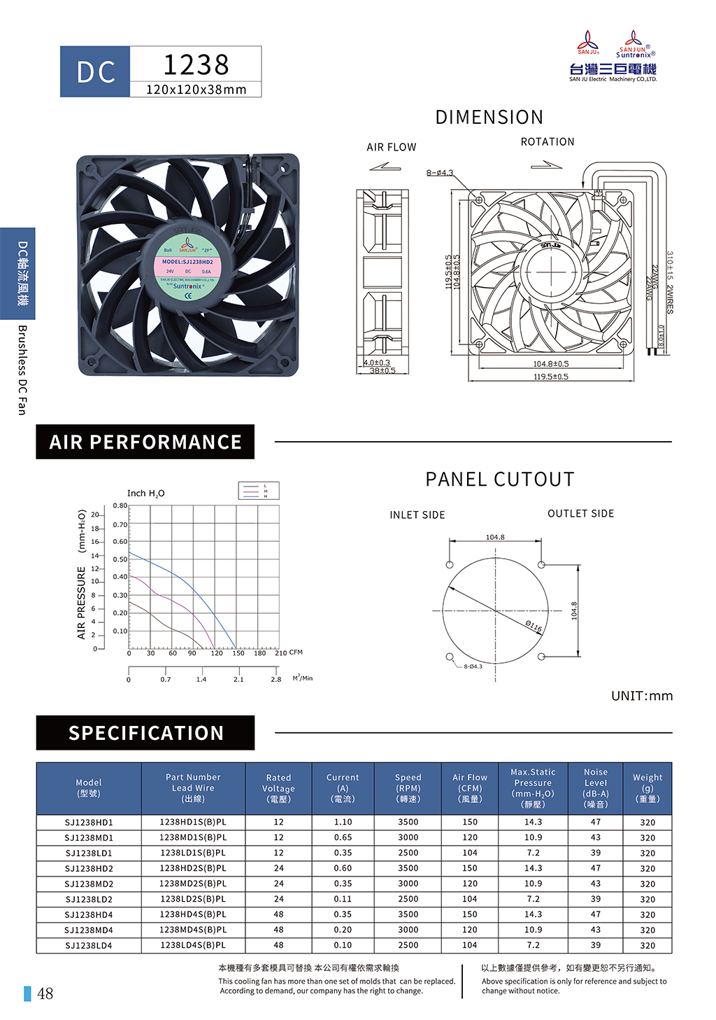 尺寸:120x120x38mm 框架: UL94V-0 軸承: 含油軸承& 雙滾珠軸承 電壓:DC 5V 12V 24V 48V 壽命:50 000Hours at 25℃--滾珠軸承 30 000Hours at 25℃--含油軸承 工作溫度:-20℃~70℃ 正常濕度 儲(chǔ)存溫度:-20℃~85℃ 正常濕度