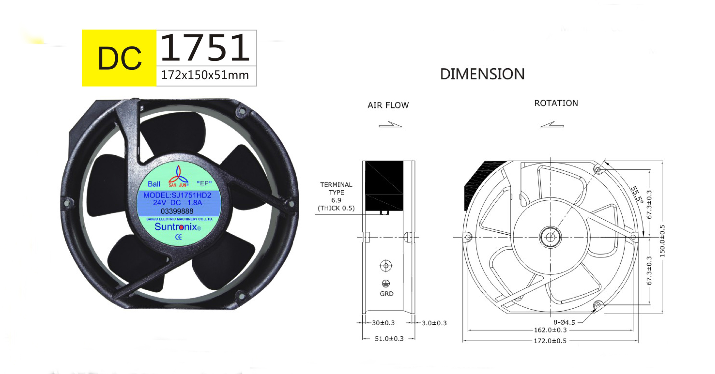 尺寸:172x150x51mm 框架: UL94V-0 PBT 軸承: 含油軸承& 雙滾珠軸承 電壓:DC 5V 12V 24V 48V 壽命:50 000Hours at 25℃--滾珠軸承 30 000Hours at 25℃--含油軸承 工作溫度:-20℃~70℃ 正常濕度 儲(chǔ)存溫度:-20℃~85℃ 正常濕度